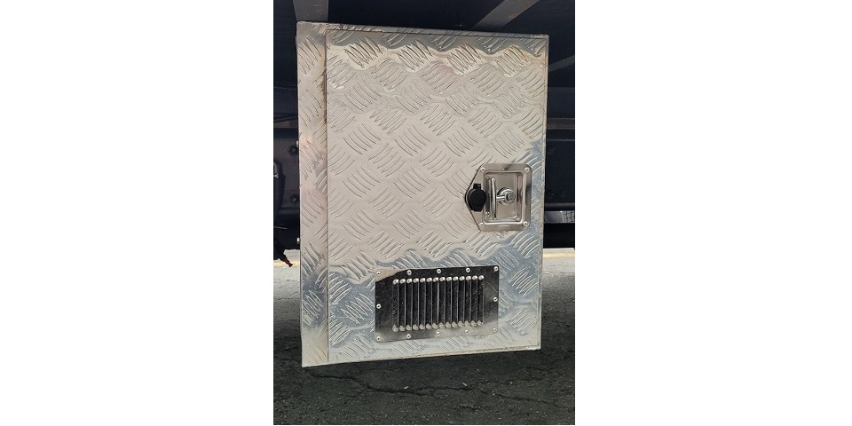 We have all seen generators on catwalks and gas cans swinging by a bungee cord behind the sleeper of a truck. I would not be happy with that installation. I wanted a more streamlined look, something that would match the rest of the truck. I chose to add a toolbox to the truck for securing the generator as well as protect it from weather, vandalism and theft. And this little powerhouse will fit in a small space. I have mine in a 24”L X 18”W X 24”H tool box and there is some room to spare. However, an aluminum toolbox would only amplify the sound of my new quiet generator and make it louder, so I lined the inside with a sound deadening/heat shield material similar to what you find under a car hood. I then cut out openings in the front and rear of the box and added louvered covers to give the generator air flow and also help deter water from getting inside. I added a couple of brackets inside to use for securing the generator to the box with a cam buckle strap, no sense in letting it just bounce around inside. Now I have what looks almost like an ordinary tool box to house my new APU.
