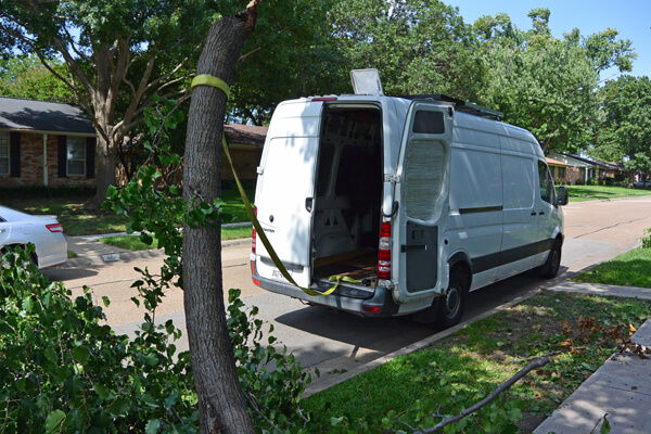 Stump puller. I ended up in Dallas for the weekend. That usually means household chores. This trip I thinned a couple trees with my Silky pole saw. I couldn't have landed the limb this way if I wanted to. It was 9' 6" long and 7 inches diameter, and it planted itself upright from above 15 feet. Wedged against the sidewalk and leaning towards the street, I couldn't budge it. Pallet pulling strap and e-track d-rings to the rescue. Now I have a very heavy, custom-sized, height clearance pole for the van.