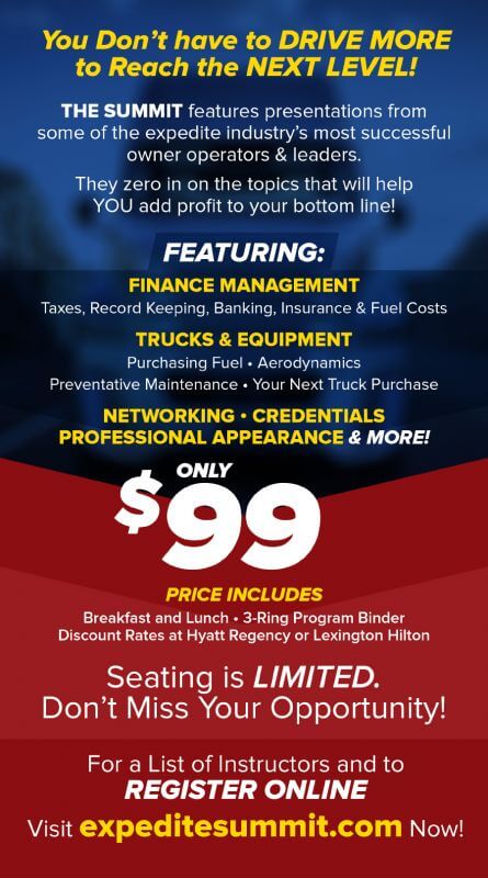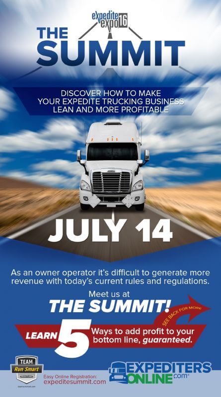 July 14th, 2016 the day before the Expedite Expo starts will be an all day workshop, "The Summit" hosted by owner operators. Workshops where we have learned the most practical useful knowledge have come when the speaker IS an owner operator. It is much easier to share and learn from someone who knows what it is like to actually drive the truck and also run the business.