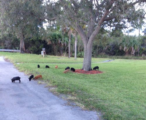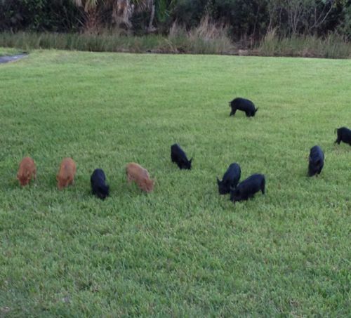 Before you get carried away we have raised many pigs and know how damaging they can become. Wild pigs are really good at tearing up the ground and this was a manicured area at this facility. I hope that this group can be trapped, as they will become a major menace to the beautiful lawns here.