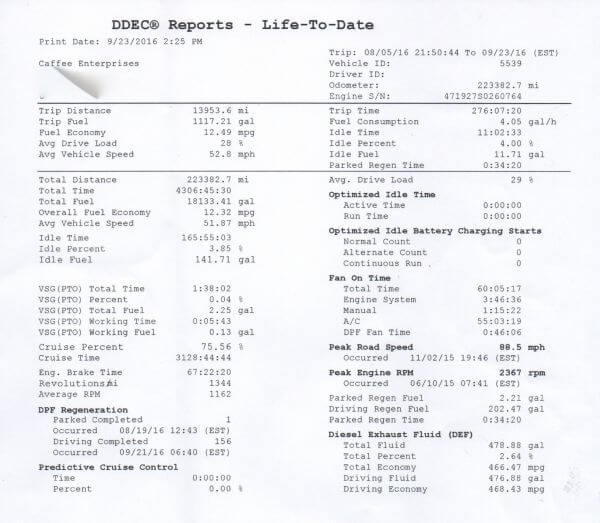 This report was run on September 23, 2016 and we have 223382 miles on our 2015 Freightliner Cascadia.