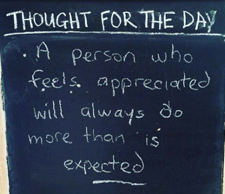 Appreciation goes a long ways not only when we are appreciated but when we appreciate others. Recognize when someone goes above and beyond and say Thank You or do something for him or her as it all comes back to you. No feedback often is interpreted as "I do not care or I did not notice" so if it doesn't make me feel good I probably will not do that again. Remember to show your appreciation in words or deeds.