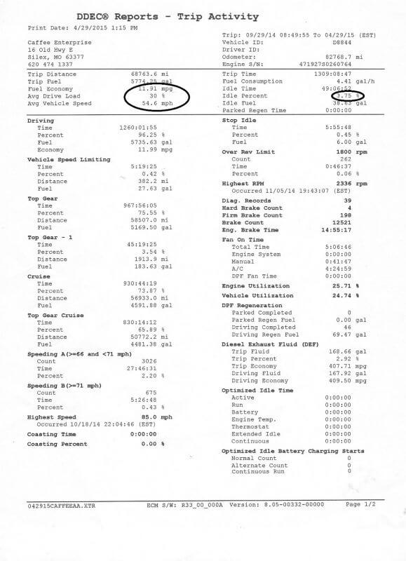Our DDEC report for fuel mileage is much closer to the odometer then our past trucks. I show our fuel mileage at 11.81 and the report has us at 11.91 and an averge speed of 54.6. This truck likes to run about 60 mph and when legal this is the speed we run.