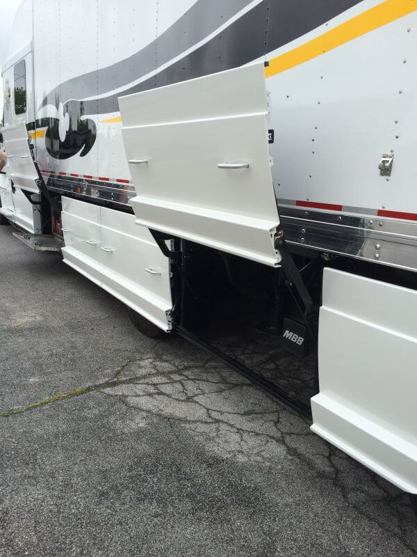 The Flirt Skirts work like the belly boxes on a bus and will be easy to rise while in parked at a truck stop in between trailers. We will add more toolboxes to the rear of the truck behind the skirts as time goes on. The Skirts are easy to open to get into exiting toolboxes as well as to check the tires.