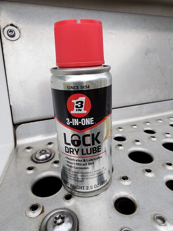 Every spring, summer, fall, and winter Stephen does lock maintenance on every lock on our 2016 Freightliner Cascadia. He even does it more often when we have been running on salt treated roads. He uses 3-In-One Lock Dry Lube and Ultra Duster air spray. Stephen is still using the original one he bought back in 2013 or 2014.