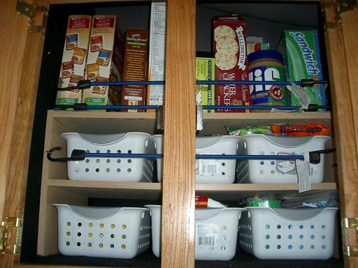 One day at a truck stop we were talking with another couple who had a sleeper like ours and she had many ideas on storage. One of her best ideas was to use baskets to contain your items. Bob had made this shelf in our cabinets and then I use the baskets for my canned goods and packages. The bungee cords help hold the baskets in place and are easy to remove so I can pull my baskets out.