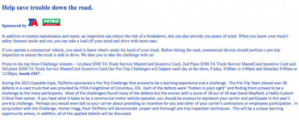 By participating in the Pre Trip Challenge at Expedite Expo you will learn how to hone your skills. Learn to see the unobvious defects that are in plain site of a DOT officer. What is really considered a defect and what is not? Many women including myself think we are horrible at performing a PERFECT pre trip and this is a chance to learn more while having fun. The challenge is for education and to learn why some things are a defect and others or not. Last year a lady who insisted that she was horrible at pre trips and did not really want to participate finally said all right I will try.... She got third and was totally shocked. Stop by the booth to not only visit but to give the pre trip a try and then come back on Saturday to see Homer Hogg, from TA/Petro show how to do a proper pre trip and to also show where the defects are.