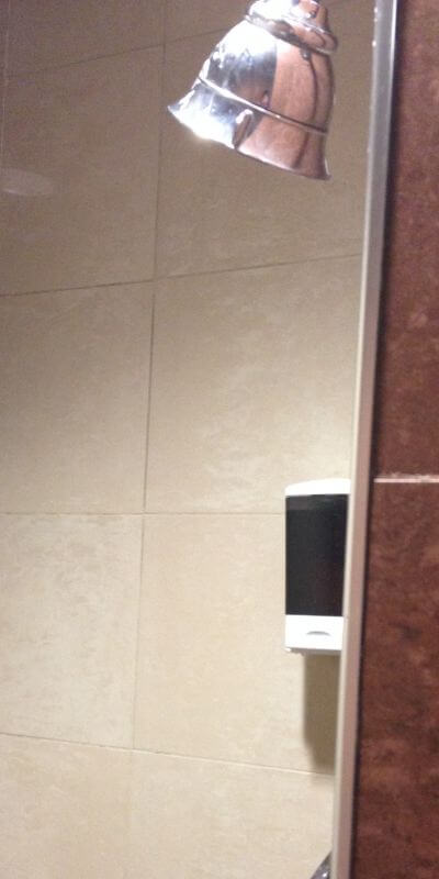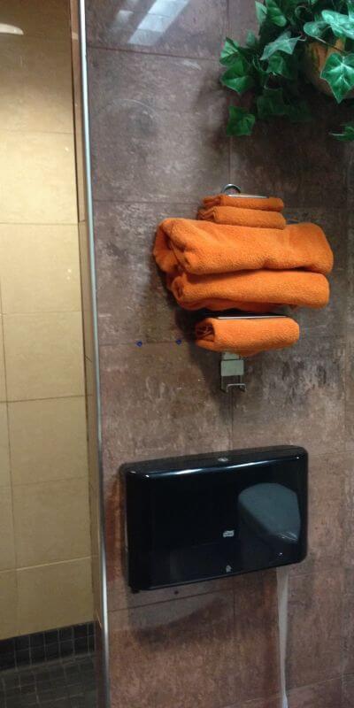 The other option is to use the kiosk and swipe the rewards card and follow the steps to have a number assigned and pin number. There are then overhead monitors that will show the numbers and then the shower that has been assigned. The monitors will also show how many numbers are waiting in line for a shower to be assigned.