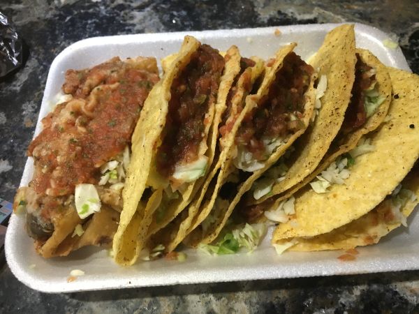 He drives an older car with a homemade trailer and stove to keep his food warm. He has a few ice chests where he keeps his homemade salsa and condiments for his food cold in the heat. He sells street tacos, burritos and has a cooler full of pop for sale.