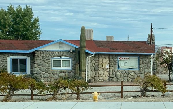 This business is in Pearblossom, CA along Highway 138 and is easy to miss. Unlike most trees, it will take the cactus years to outgrow the notch in the roof.