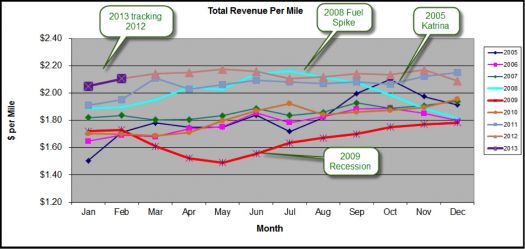 The February 2013 vs. January 2013 had the two fewer (10%) business days, so the decrease in business (month to month) is easily offset by the variance in business days. January 2013 had about 10% more business days compared to February. It is refreshing to see line-haul rate/mile inch upwards, reversing the downward trend we have seen in the past several months and is more a seasonal upswing rather than a general trend.